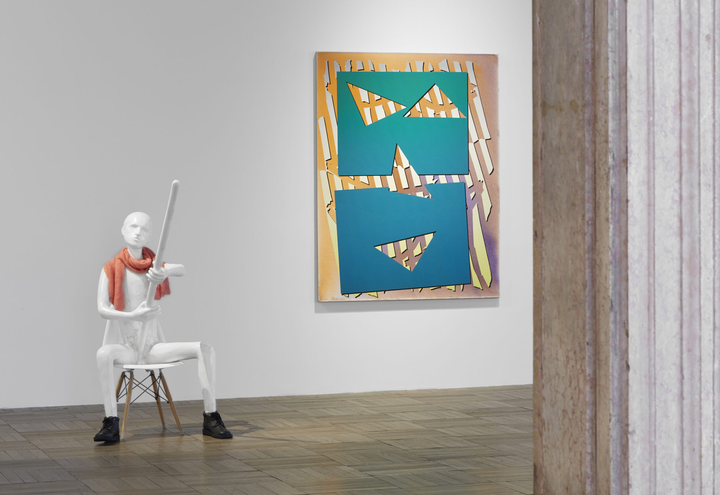 In Eddie Peake’s Komodo Dragon series the body itself is the agent of pleasure. These unadorned sculptural forms, dressed as they are in white with minimal clothing, suggest themselves of absence and want. Each figure thanklessly tugs at the phallic shape that extends itself out into space. There is something desperate in these works, a desensitization lessened only by the lonely, self-sufficient gesture of masturbation.