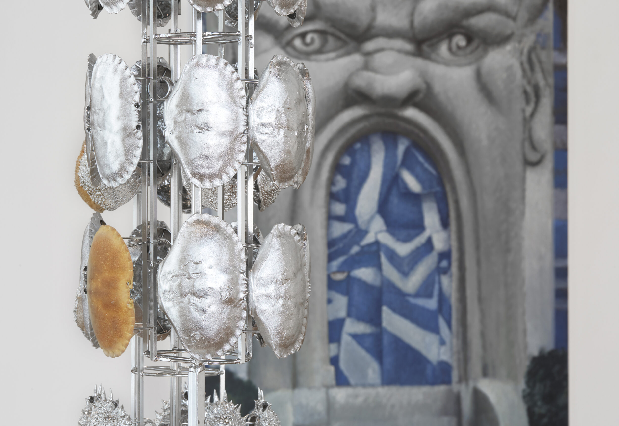 Alice Channer is concerned with the materials, labour and production processes that give this pattern form. Take for example Crustacean Satellites (Triple Maja Brachydactyla, Four Cancer Pagurus), 2018, a series of metallised crab shells, hung systematically on circular stainless steel jigs. Channer’s compositions jar on the spontaneous and rational, bringing focus to contemporary tensions existent in industry and nature. In so doing the artist gives form to the pervasive anxiety, which occupies mankind’s deteriorating relationship with the organic environment.