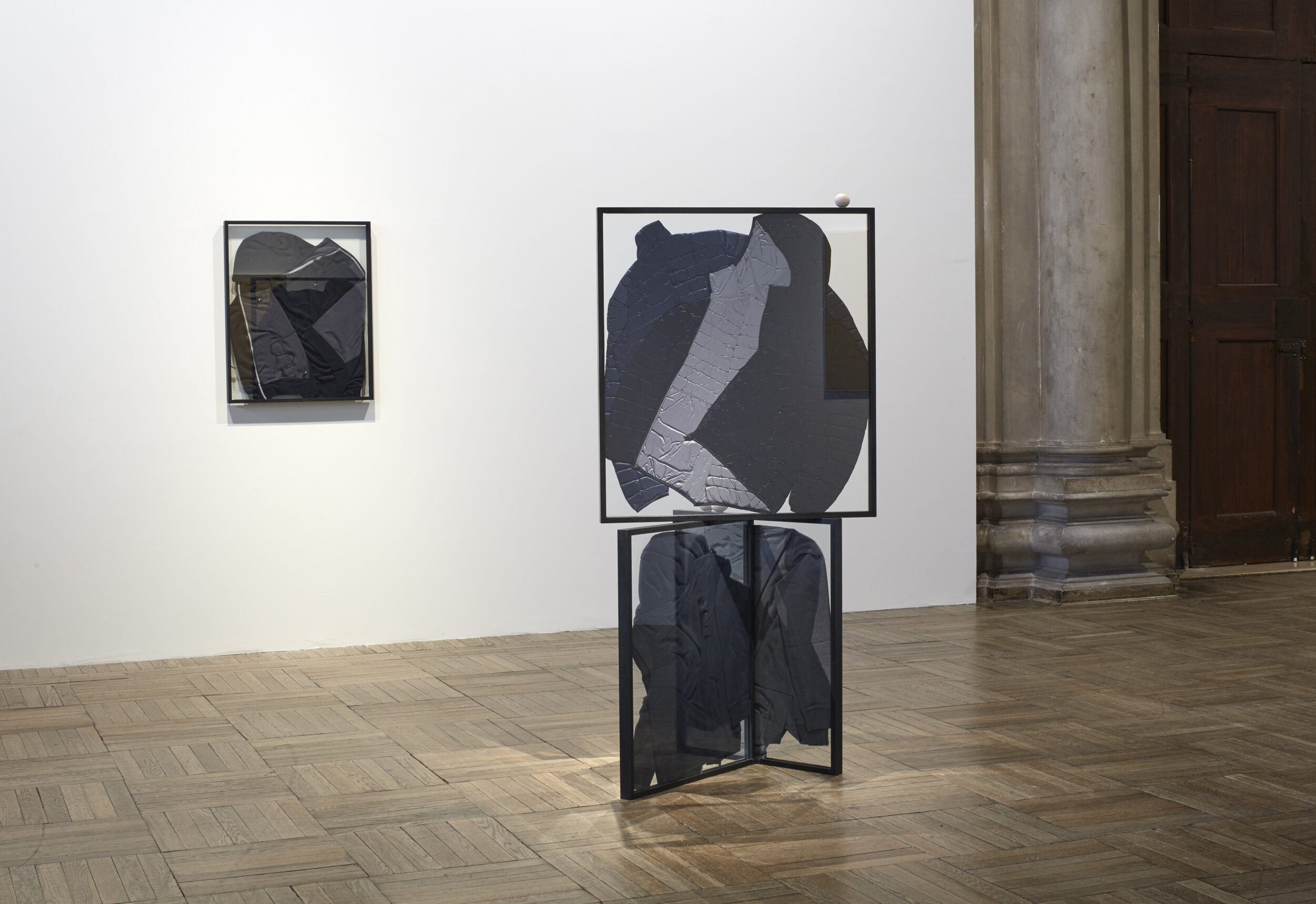 Inhibition is a key preoccupation in the work of Prem Sahib. In Taken By Your Equivocal Stance III, 2015, Sahib uses the sports hoodie to invoke the tactility of masculine bodies, of their togetherness, whilst simultaneously frustrating the senses, inhibiting touch by way of the glass panelled structures in which they are framed. The close physical proximity described in these compositions only goes to enhance the loss of something far less tangible, a suffocated expression of desire, a cry for a certain kind of love.